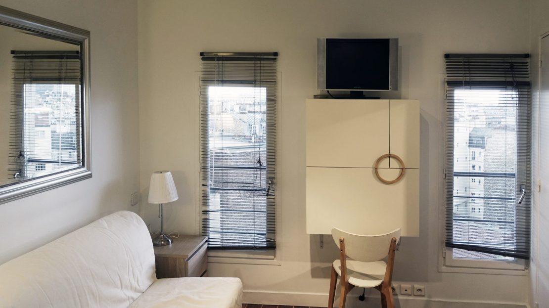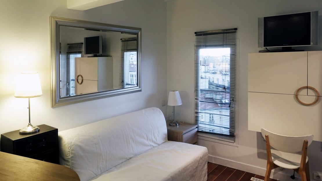 Rue Froidevaux, near Montparnasse, studio on the 8th floor with an elevator in a building from the 1930’s with entry code and building caretaker. Living space with open view on the skies of Paris, with a full-size sofa bed, kitchen area with ceramic hotplates, refrigerator, microwave oven… Designer bathroom, sink, and toilet (hot water provided by the building). Close to the Daguerre market, in neighborhood with all the service, Vélib and Autolib stations.